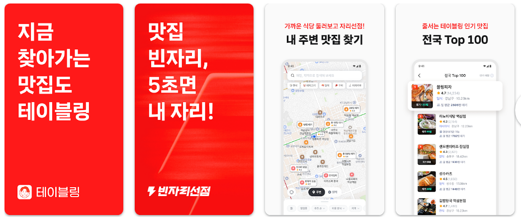 테이블링은 음식점 대기 관리와 예약 기능에 특화된 어플로, 인기 매장의 대기 현황을 실시간으로 확인할 수 있는 것이 특징입니다. 현장 방문 전 대기 시간을 파악할 수 있어 효율적인 외식 계획이 가능합니다.